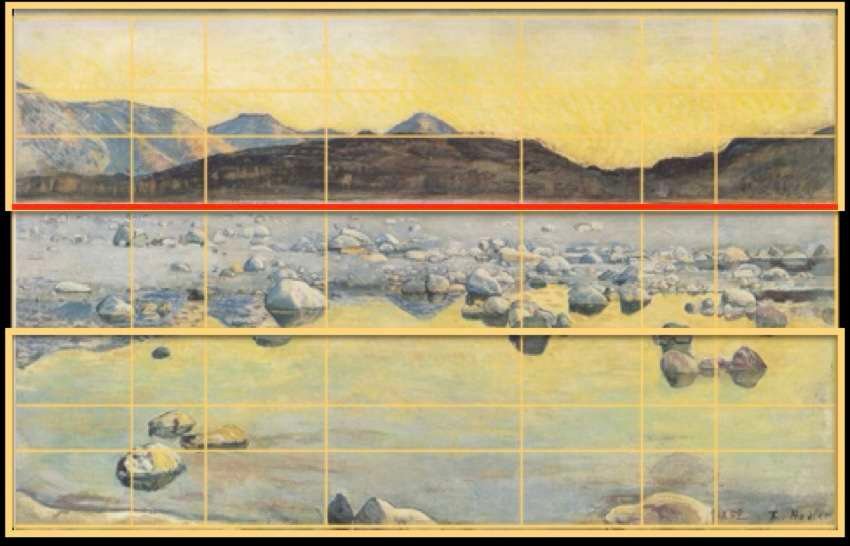 Comparez le placement de la ligne d’horizon par rapport à la hauteur du tableau et à la position de l’articulation du poignet dans un avant bras humain. Les différents groupes composant le tableau sont disposés également selon cette même logique.