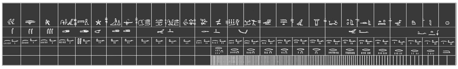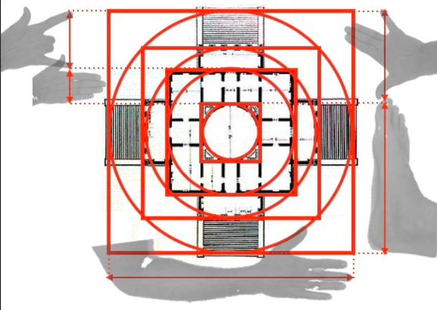 Se observarmos mais atentamente a forma como estes quadrados e círculos concêntricos estão distribuídos, verificamos que as relações entre estas diferentes figuras geométricas correspondem proporcionalmente às relações entre a palma da mão, a palma da mão, o palmo, o pé e o côvado.