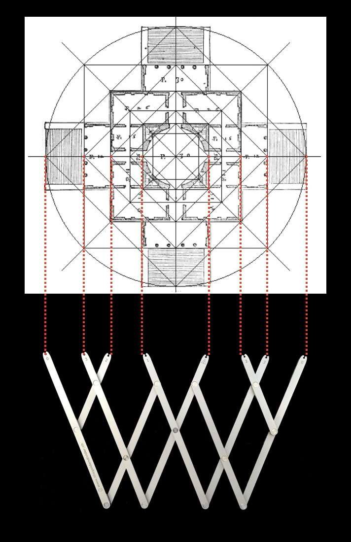 Abaixo, a planta baixa e a fachada da Villa Rotonda em Veneto, construída por volta de 1570 pelo arquiteto Andrea Palladio. À direita, uma linha de regulação determina a estrutura geral do edifício, bem como o seu ritmo. Estas linhas estruturais servem para dar equilíbrio e uma dinâmica clara ao edifício. A composição geral baseia-se em círculos concêntricos e quadrados.
