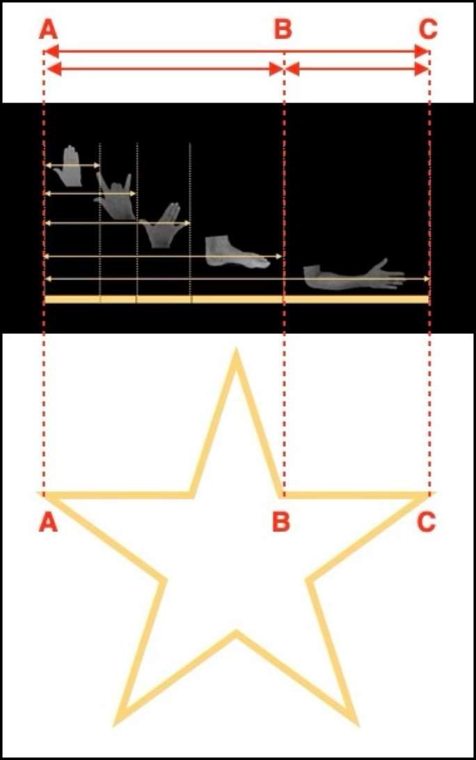 Na figura abaixo, podemos ver que a relação entre o côvado e o pé é idêntica à relação entre os segmentos AC e AB, e os segmentos AB e BC da estrela de cinco pontas.