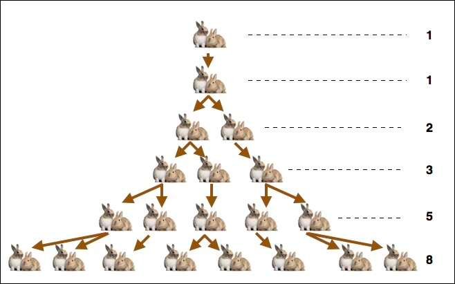 Diz a lenda que Fibonacci descobriu esta sequência matemática ao examinar a reprodução de pares de coelhos; um par de coelhos gera outro par, que por sua vez gera dois pares de coelhos, que por sua vez têm vários bebés, e assim por diante..