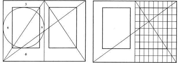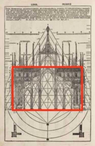 A figura da esquerda mostra uma análise da fachada do Duomo, a catedral de Milão, utilizando um esquema regular baseado em círculos concêntricos e triângulos.
