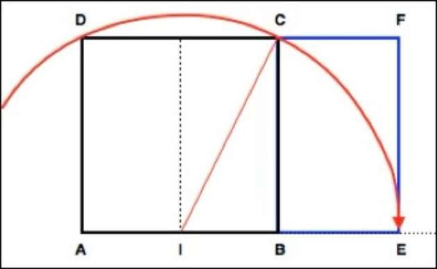 O esquema abaixo mostra as etapas da construção de um retângulo áureo: este é obtido a partir de um quadrado ABCD. Um arco de circunferência de centro I (o ponto médio de AB) e raio IC intersecta a reta AB no ponto E.